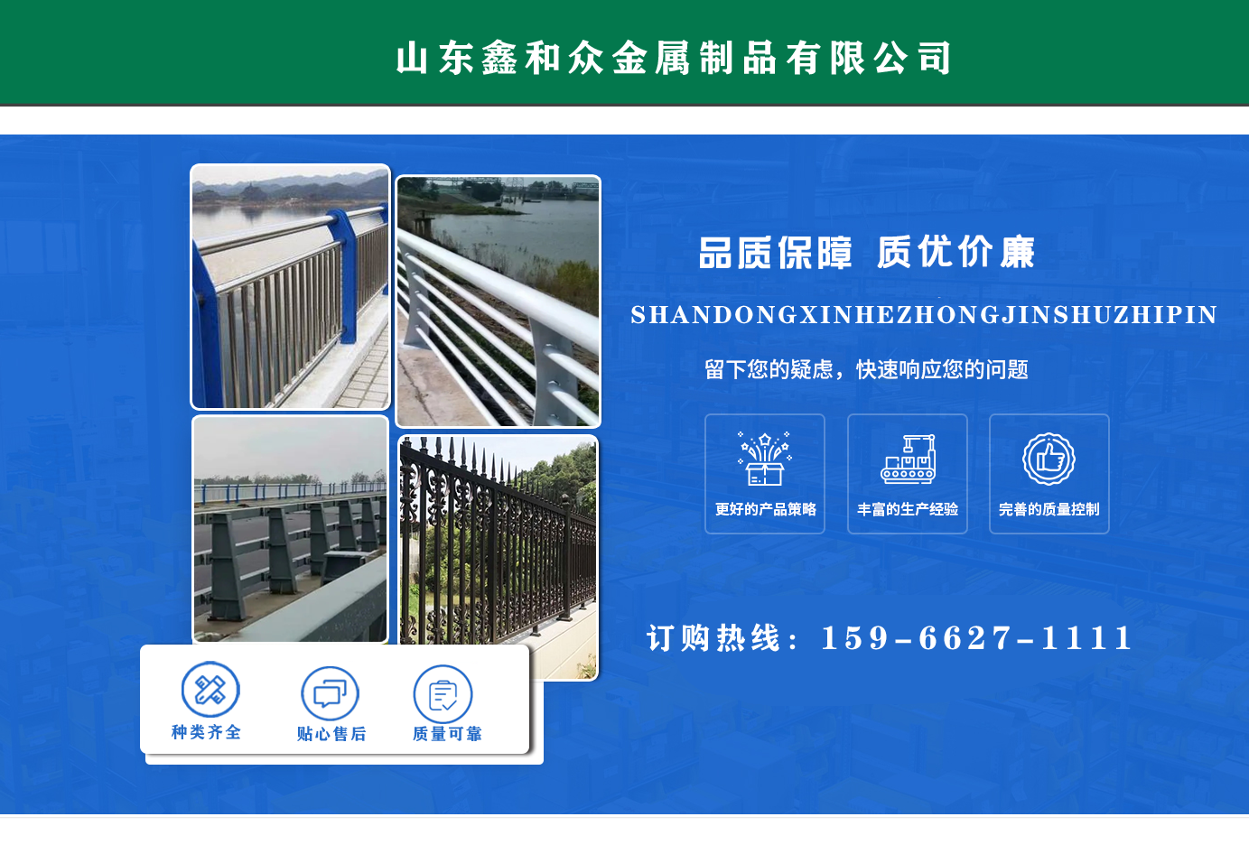 山東鑫和眾金屬制品有限公司主要產(chǎn)品有防撞護(hù)欄,橋梁護(hù)欄,道路護(hù)欄,河道護(hù)欄,不銹鋼護(hù)欄等護(hù)欄。提供設(shè)計(jì)方案,一站式定制,包您滿意價(jià)格優(yōu)惠,歡迎來電咨詢!    公司常年從事銷售護(hù)欄防撞護(hù)欄,橋梁護(hù)欄,道路護(hù)欄,河道護(hù)欄,不銹鋼護(hù)欄,橋梁鋼護(hù)欄,河道燈光護(hù)欄等。產(chǎn)品廣泛應(yīng)用于橋梁、河道、旅游景區(qū)、道路、公路、公園、小區(qū)、景觀、道路防撞等領(lǐng)域?!   」井a(chǎn)品均采用優(yōu)質(zhì)不銹鋼材料,符合相關(guān)標(biāo)準(zhǔn)。各種型號(hào)不銹鋼復(fù)合管及護(hù)欄,質(zhì)量嚴(yán)格把控。產(chǎn)品強(qiáng)度高、耐腐蝕、焊接牢固、抗沖擊、性能好,防撞護(hù)欄結(jié)構(gòu)簡(jiǎn)單、美觀實(shí)用大方。     歡迎前來訂購(gòu)!...